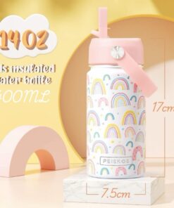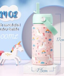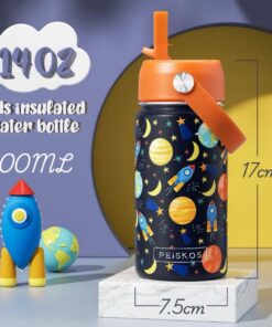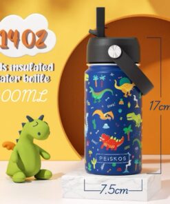PEISKOS Insulated Water Bottle Leak Proof Flask with Straw for Kids 400ML – Blue Dinosaur