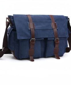 Retro Military Men’s Canvas Crossbody Bag Leather Canvas Laptop Bag – Blue