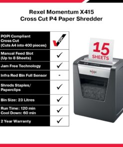 Rexel Momentum X415 P4 Cross Cut 15 Sheet Paper Shredder, 23L Bin