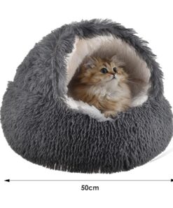 Cat Bed Round Plush Hooded Pet Bed Calming Cave For Small Dog Cat – 50CM – Dark Grey
