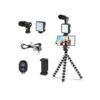 -Vlogging kit is designed to enhanced your videos with better sound and lighting either indoor or outdoors it include a universal microphone an LED light, a tripod Grip remote control and a smartphone adapter with built-in shoe.