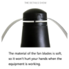 Excellent design: the fan fly has a practical hook on the bottom for hanging. The high-quality rotor blades are made of extra soft plastic and stop immediately when touched, there is no risk of injury.