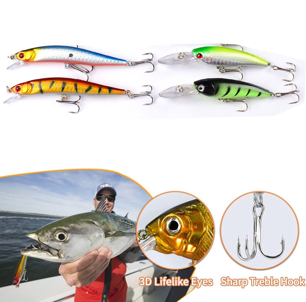 Plastic Floating Baits Set – Appearance and structure design inspired by real fish, wildly targeting bass trout etc. Lifelike 3D eyes, attractive colors lures attract all kinds of fishes