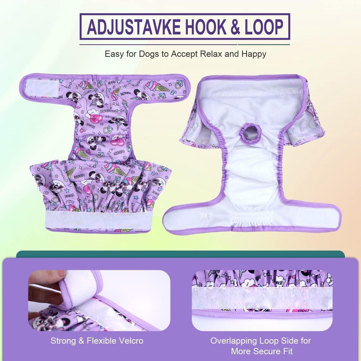 Easy to Put On and Portable The diaper is extremely easy to put on and take off with adjustable hook-and-loop tabs for a great customized fit. Flexible hook&loop closures don’t stick to fur, more importantly, they stay on, so you can let your pet roam freely in the house without accidents!