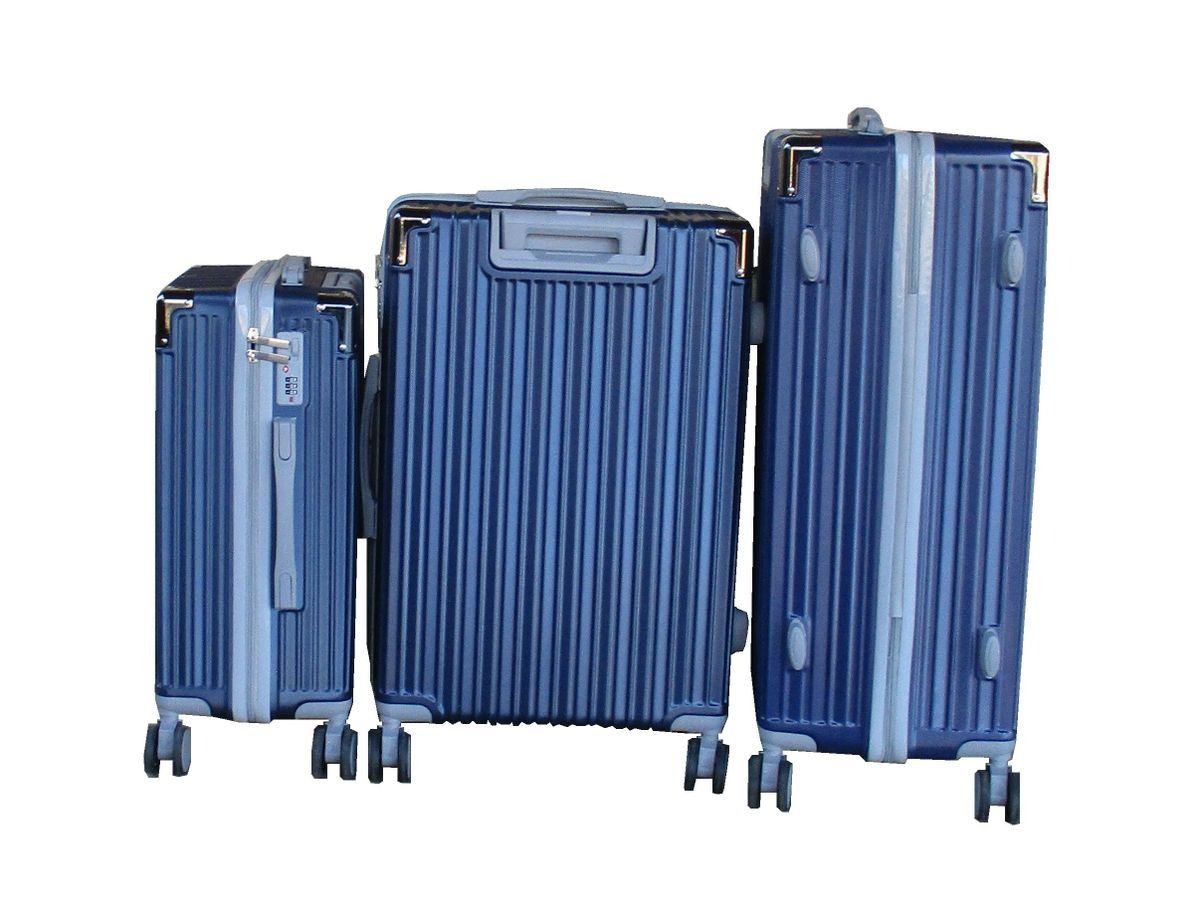 Navy blue luggage, 3-piece luggage set, spinner wheels, ABS hardshell, durable luggage, travel suitcase, telescoping handle, built-in lock, combination lock, scratch-resistant suitcase, lightweight luggage, multi-directional wheels, travel case set, luggage for travel, stylish luggage, reinforced corners, suitcase with wheels, luggage set with lock, hardshell suitcase, organized luggage, compression straps, zippered compartment, carry-on luggage, checked suitcase, ergonomic handle.