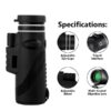 This 40 60 High Powered Dual Focus Monocular Scope is a portable travel telescope that makes a great addition to any outdoor kit. With high grade multi coated lenses, it delivers a fantastic viewing experience wherever you go and allows you to see true to life colour definition without impairing your visual experience. Designed with adjustable eye cups, 40*60 monocular scope is incredibly comfortable for users who wear glasses. The eye cups can be easily and rapidly twisted up and down for optimal viewing with or without glasses. To adjust focal length easily, this HD Zoom Optical Lens is constructed with One-Hand Focus Wheel making it a user-friendly monocular.