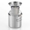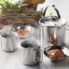 Stainless steel. Anti-rust, durable stainless steel construction. The boiling pot with a bail handle hung over the campfire. The handles are foldable for easy storage. Great cooking set for camping, hiking, backpacking, etc.