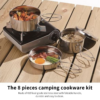 Package Included: The 8-piece camping cookware kit includes 2 pots, 1x pan, 2 cups,1x Lid, and 2 saucers, suitable for 2 people