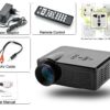 This Mini LED Projector has 3.5 inch LCD screen and 80 Lumen which offers images from 30 to 100 inches at 640×480 resolutions with 1080p video support, as well as HDMI, AV, USB, VGA and TV connections