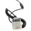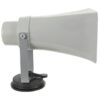 Active horn speaker with adjustable bracket and removable suction cup base for attaching to a vehicle roof. Power is connected via a 12V cigar lighter lead, delivering up to 25W power output. A detachable handset houses a push-to-talk microphone along with all controls and connectors for other functions. The top of the handset has ports for USB and SD media to allow audio playback and a 3.5mm auxiliary line input for external audio sources. An integral record function enables a speech message to be recorded up to 120 seconds and played back as a loop. Siren and whistle alerts can be activated by push buttons. Designed for mobile announcements or permanent installation for public address or alerts.