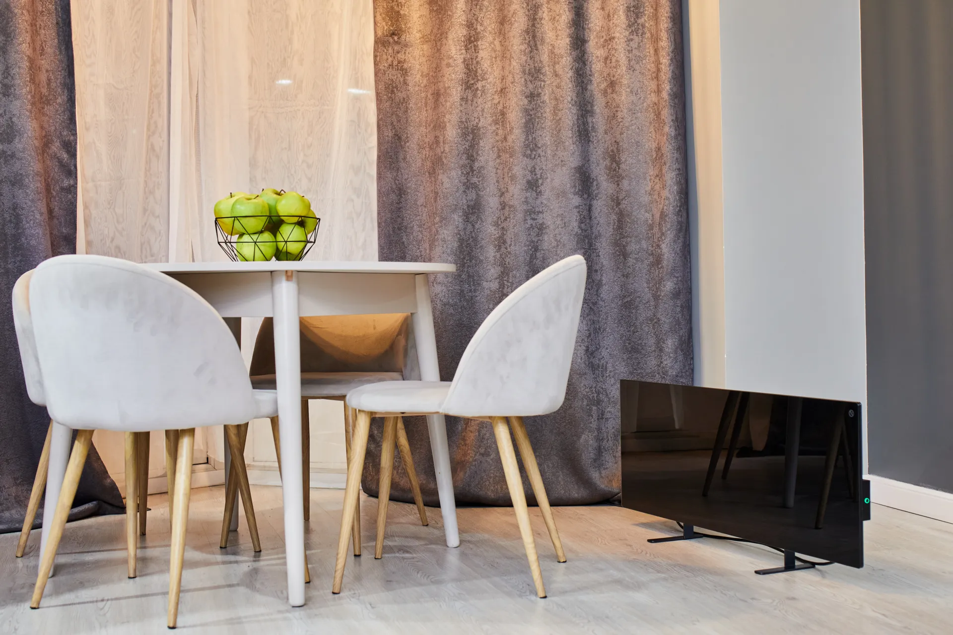 Ultra clear enameled glass. Fits any room, thin and strong 11mm glass, easy installation, infared and convection heating method (uses 700W) Adaptive room temp and time scheduler. Control with your mobile phone via the app.