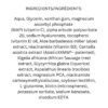 Magnesium ascorbyl phosphate (MAP) (vitamin C), alpha arbutin, sodium hyaluronate, tocopherol (vitamin E) oil, Aloe barbadensis miller (aloe), niacinamide (Vitamin B3), Centella Asiatica extract (AsiaticXXMMâ patented), Kigelia Africana (African Sausage tree), Glycyrrhiza glabra (liquorice), Aspalathus linearis (rooibos), magnesium PCA, niacinamide