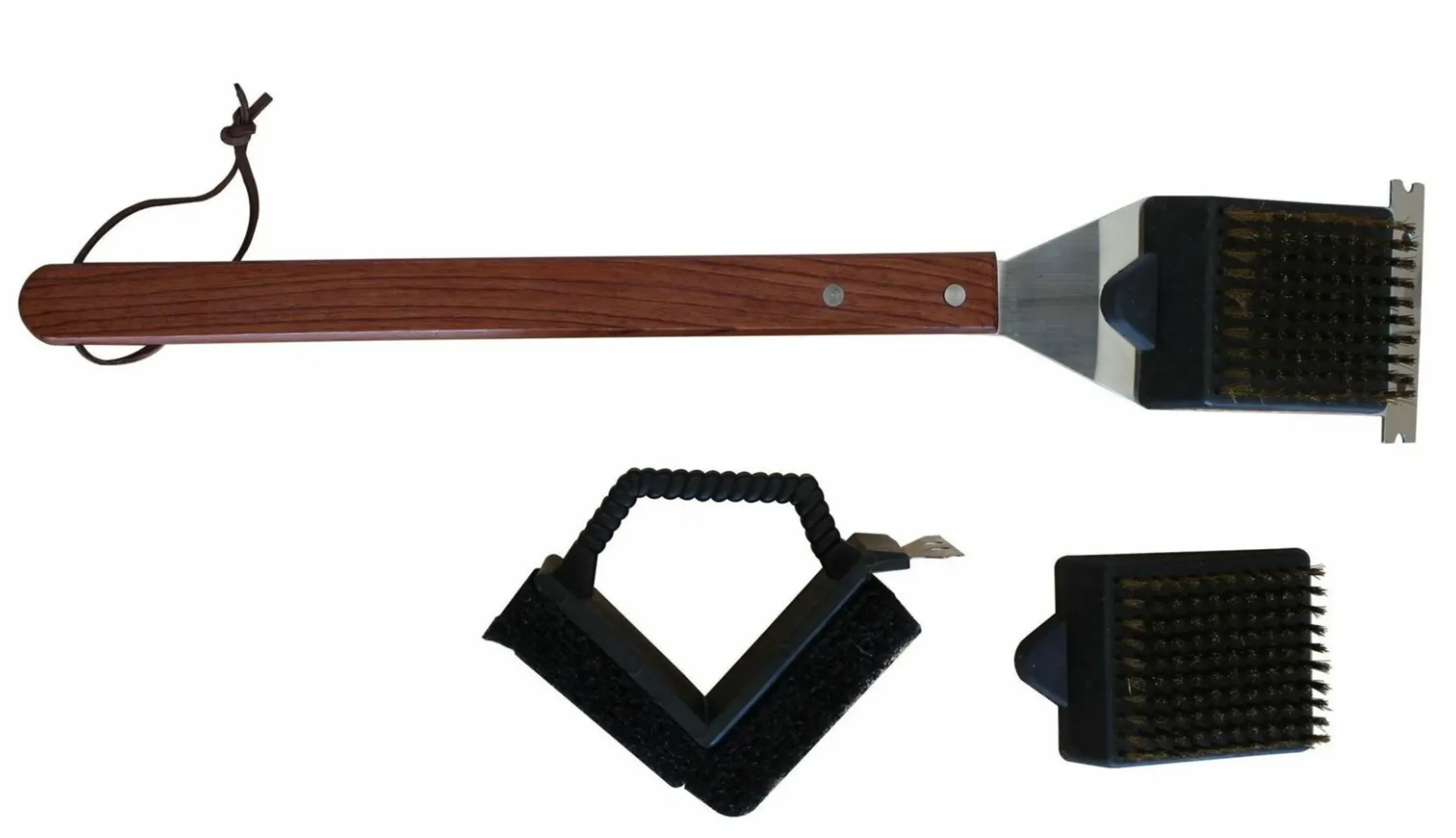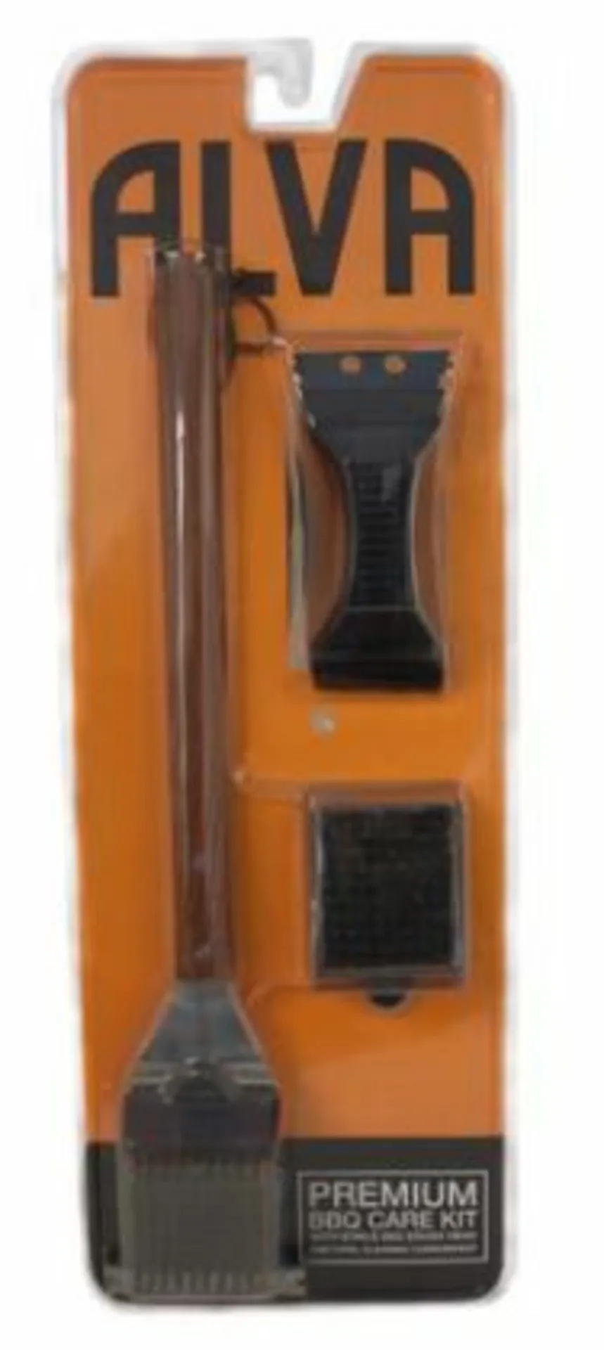 We make our Alva Accessories to enhance your Alva experience. The set consists of: Â Long wooden handle brush with durable brass bristles, Replacement BBQ brush head and Plastic-handled grid scrub/scraper tool.