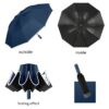 – The design of the reverse folding umbrella makes it easier to use when entering and exiting the vehicle. You can open the umbrella and place it on the car door before entering the vehicle without bringing rainwater into the car.