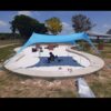 It is supplied with 2 foldable stability poles with soft tops and ground stakes that let you use it on sandy beaches, thick grassy areas or even in rocky camping spots. It only requires one person to set up the Lean-to sun shelter.