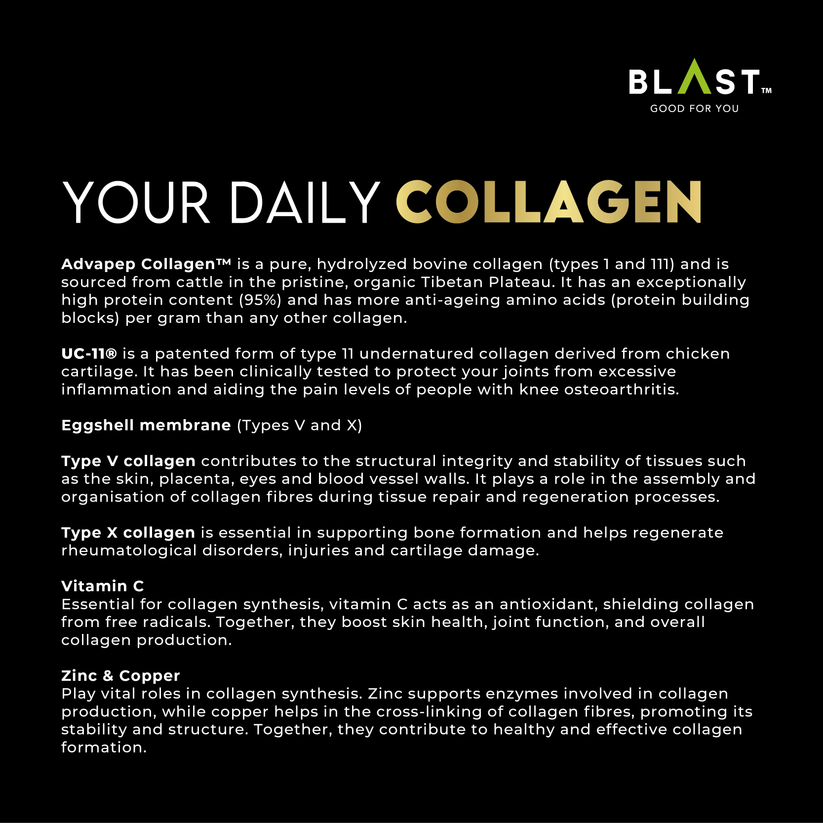 BLAST Daily Collagen is pure hydrolyzed collagen (Type 1, Bovine) enhanced with LactoSpore Probiotics and buffered Vitamin C.