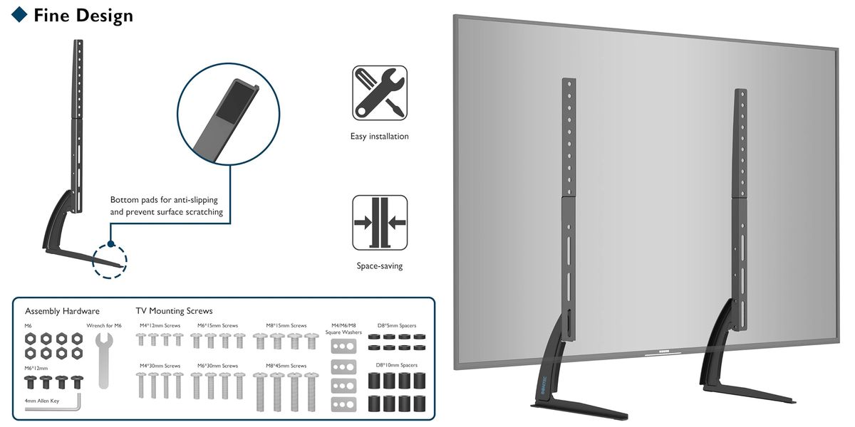 - LOW-PROFILE & SPACE-SAVING DESIGN: The space between two legs provides perfect placement for audio equipment or accessories; sturdy steel construction with two-leg system allows for high stability and durability; bottom pads prevent surface scratching