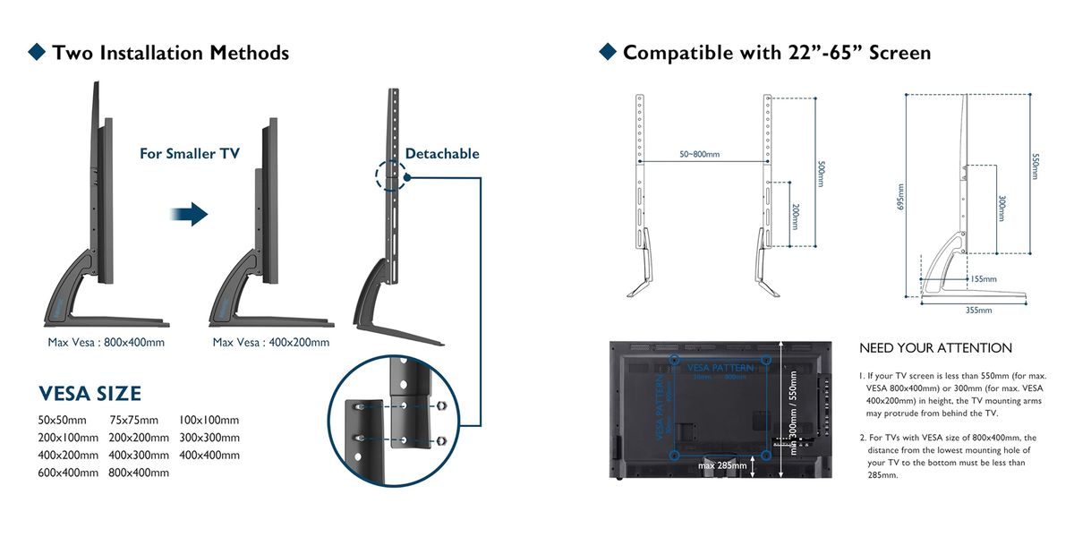 - 2 INSTALLATION SOLUTIONS: Middle section unscrews to provide a perfect solution for smaller TVs (22″ with max. VESA size of 400 x 200 mm). Please note: If your TV screen is less than 300 mm in height, the TV mounting arms may protrude from behind the TV