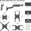 - ADJUSTABLE: The monitor wall mount can hold any 13-42-inch monitors or TVs up to 8kg. The VESA mounting is 75×75/100×100/100×200/200×100/200×200. Full motion adjustable arm offers -35 /+35 tilt, 160 swivel, 360 rotation, providing the best viewing angle with ergonomic comfort to reduce neck, shoulder, or back pain.