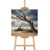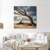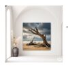 – A stunning visual of driftwood on the beach in front of a stormy sky.