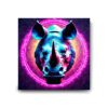 This striking piece features a vividly colored rhinoceros set against a cosmic, circular backdrop that seems to radiate energy. The rhino itself is rendered in shades of blue and pink, with a dynamic contrast that gives the image a three-dimensional quality.
