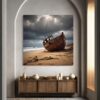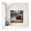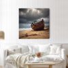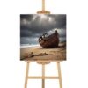 – Stunning and dramatic visual of a rusted shipwreck washed onto a desolate beach.