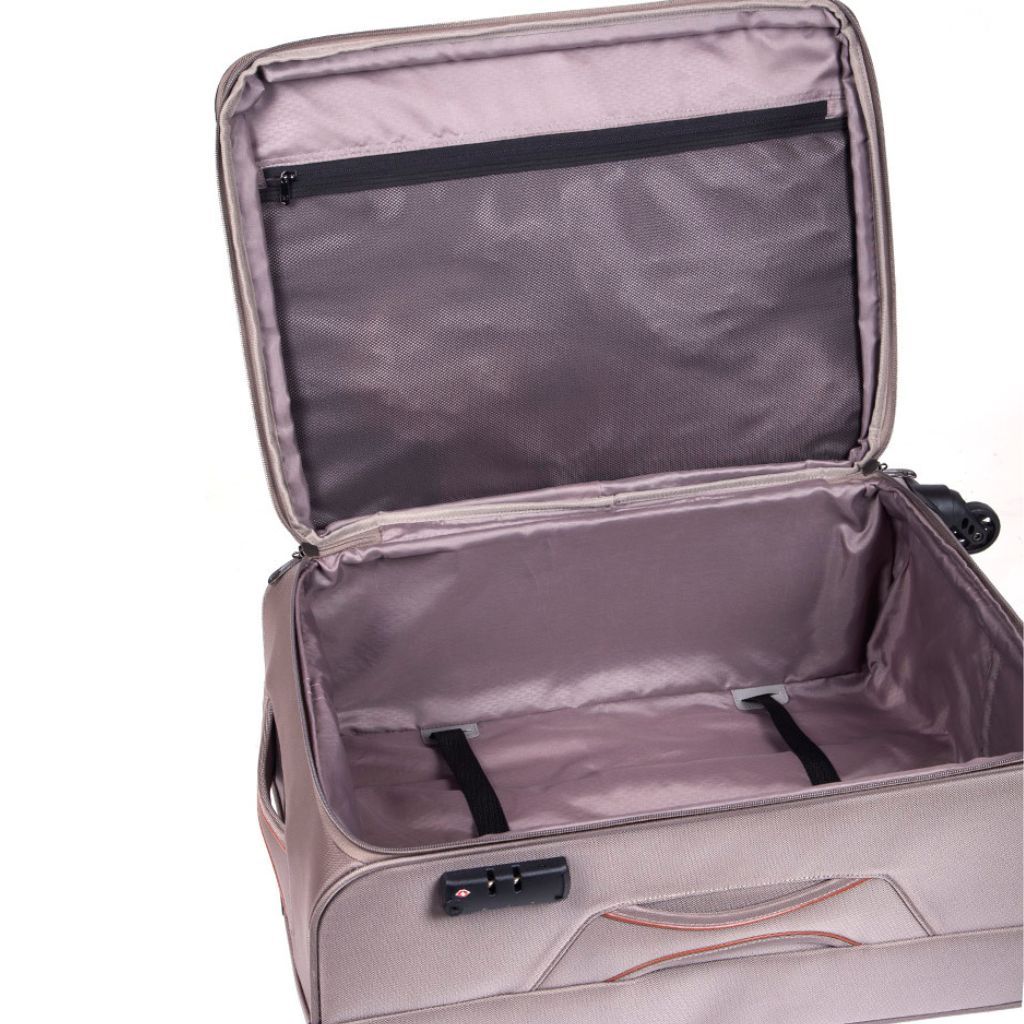 4 single spinner wheels drive the case along with a retractable telescopic handle system. The Cellini systems include a Safe-T-zip dual-toothed mechanism to lower the chances of any pilferage through the zipper, all closed with a TSA-recognised 3-dial combination lock that is integrated into the side of the suitcase.