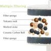 Filtration system made up of filter sponge layers, volcanic rocks, medicinal stones and ceramic carbon balls to purify the water and remove odours.