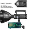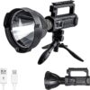 The High Lumen Rechargeable LED Spotlight Flashlights can be recharged repeatedly which has a built-in large-capacity battery and equipped with a USB output port. The amazing advantage is the bright flashlight just like a power bank charge your device quickly and conveniently ,Super Bright Searchlight is also a good companion for you to go out as emergency candles. It also has a battery indicator. The Super Bright Searchlight with 4 lighting modes: low, medium, high brightness and strobe. The shot updated IPX6 waterproof tactical flashlight can be used normally in any awful weather such as rain or snow or fog.(Warning: Don’t put it in the water directly)This large Searchlight with Foldable Tripod, large lighting distance, rotatable and removable equipped with a tripod. When you go outside such as hiking, camping, hunting, adventure, night fishing etc., our outdoor Camping Flood Working flashlight can perfectly set your hands free. This rechargeable LED spotlight is made of high-quality ABS and polycarbonate, which is very durable and can protect the spotlight from drops and collisions during use. Lightweight, long time use will not let the hand feel tired.