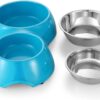 This double bowl feeder including 2 x stainless steel portable feeding bowls. for use with serving wet or dry foods and water.
