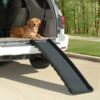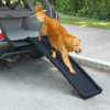 This foldable plastic dog ramp is a portable and collapsible ramp designed to help dogs, especially those with mobility issues or smaller breeds, easily access elevated surfaces like cars, beds, couches, or stairs. The ramp is constructed from lightweight yet sturdy plastic materials, making it easy to carry, set up, and fold away when not in use. The ramp is designed to be folded into a compact size for easy storage and transport.