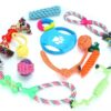 – 12 pack different dog toys, Including chew rope toy with rubber ball, dog cotton ball, ball on rope dog toy, dumbbell-shaped puppy toy, tug of war dog toy, fetch stick dog toy.