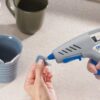 The Dremel 910 is a high temperature of 165 degrees Celsius glue gun with a drip-control precision tip. Because of its compact size and good ergonomics (T-handle, stable base, extendable stand), it is ideal for quick light DIY jobs around the house, such as gluing ceramics, wood, plastics, glass, etc.