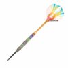 Dazzle your opponent with a vibrant display of skill with the Elkadart Rainbow Steel Tip Darts. These darts are packed with features starting with the barrel, fashioned from 90% Tungsten and 10% Nickel. Tungsten is a very dense metal, able to create slimmer darts with the same weight as lighter metals; this allows for tighter shot groupings without sacrificing control, increasing your scores. Tungsten is a sign of quality and durability as well because of its density. A higher tungsten content will produce a slimmer dart profile than one with less. More tungsten in the dart increases the price as tungsten is a rare metal and its density takes more effort to machine. The increased price gives a higher quality barrel and can improve performance, increasing scores. Each titanium coated barrel enjoys deep shark fin ridges, allowing your grip to remain consistent throw after throw. The Rainbow Darts feature tough, 100 micron flights with flashy rainbow graphics. The extra hardiness these flights feature means that you won't need to replace them as often – they'll stand up to the toughest throws. Finally, each dart is precision machined for maximum aerodynamics and a sleek, smooth look and features a stylish signature Titanium Rainbow look found in no other dart.