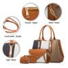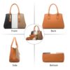 Our high-quality faux leather multicoloured 4pc handbag set is made from high-quality PU leather with great attention to detail – see pictures. The handbag is medium-sized and big enough to hold daily essentials such as a power bank, wallet, phone, makeup accessories, keys and so on. It has two inner pouches and two zipped compartments inside. The clutch bag is a decent size with a magnetic button to open and close easily, suitable for holding makeup brushes and other select items. It also includes a handy purse and wallet holder. One adjustable shoulder strap is included which can be used with either the main bag or clutch. A perfect affordable and trendy matching handbag set to compliment your office outfit or for a casual outing.