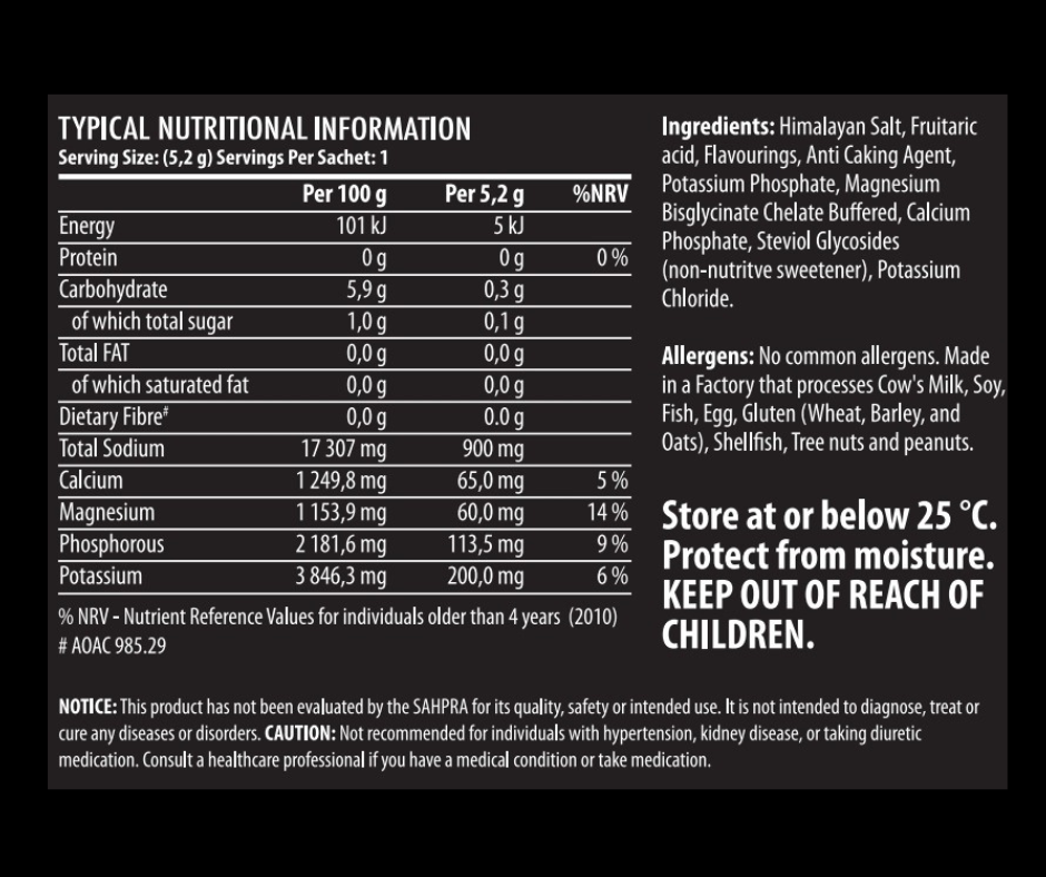 NOTICE: This product has not been evaluated by the SAHPRA for its quality, safety or intended use. It is not intended to diagnose, treat or cure any diseases or orders. CAUTION: Not recommended for individuals with hypertension, kidney disease, or taking diuretic medication. Consult a healthcare professional if you have a medical condition or take medication.
