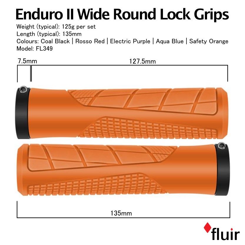 Fluir Enduro II Wide Round MTB Cycling Lock Grips are 135mm wide which allows riders with larger hands to used them comfortably and now features a reduced weight with increased durability due to higher grade TPR material.