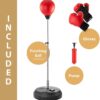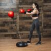 The Free Standing Speed Bag Kit features an adjustable speed bag stand and pair of gloves. The design allows for easy movement around the target to increase cardio, leg conditioning and hand-eye coordination. The height is adjustable from 125cm to 145cm. The high-density base can be easily filled with water or sand in order to ground it. Hand pump included to inflate the speed bag.