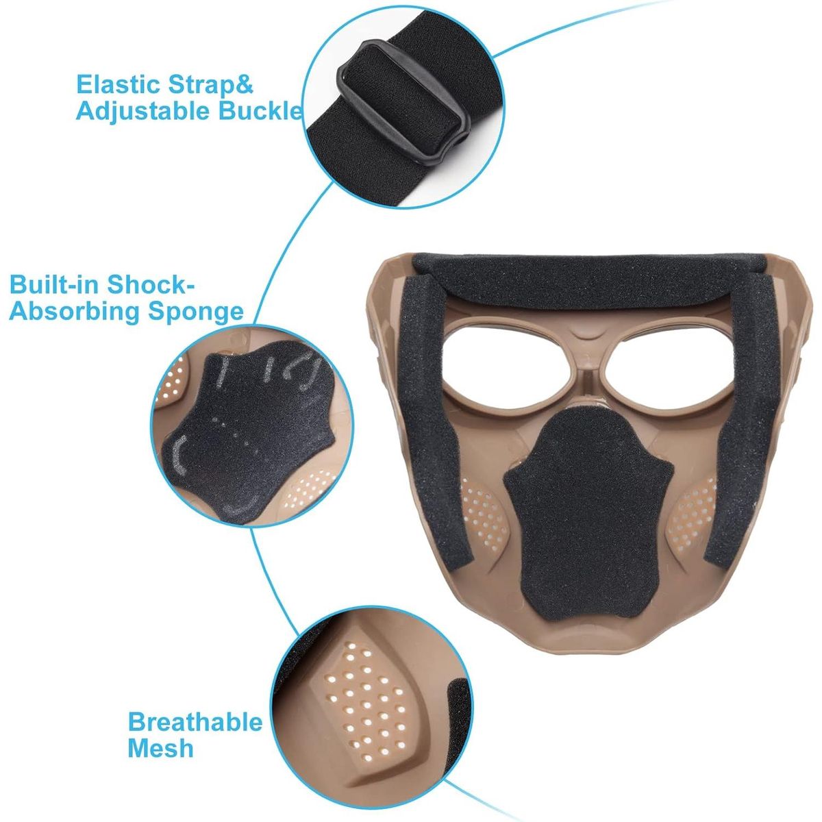 – breathable mouth filters and holes provide better air permeability. There are round holes around the goggles to help the internal air circulation. And the front section of the mask has a plurality of venting holes covered by a sponge to help us filter the dust in the air, ensure air circulation, and avoid exhaled air fogging the paintball mask goggles lens.
