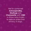 Weâve combined Ashwagandha, Skullcap and Chamomile with CBD in these tasty treats to reduce stress and anxiety in dogs.