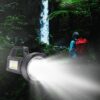 6 Lighting Modes : Super bright spotlight flashlight with 6 brightness modes: strong, weak, SOS ,red warning ,Strobe. Multi functional side light allows you to use it as a camping light&warning light in fog and haze weather.LED Super Bright searchlight flashlight uses the upgraded lamp holder to provide super bright light, and the beam distance is more than 500 meters, which farther and brighter.