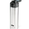 – Push-button, flip top cap locks closed for transport and locks open for easy drinking.