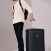 Staging trolley handle, top carry handle, plastic corner guards, 3-dial combination lock, debossed signature peony 4G PU material