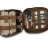 Designed to cope with all kinds of haemostatic emergencies and stored in an organised manner so that all the items it contains can be easily removed. It can be fastened to the cuff with two hook and loop straps and a quick-release buckle and is also provided with two horizontal elastic bands which make it easy to attach to the leg if necessary, ensuring that it is firmly attached to prevent any unwanted movements. It also has an external back with a molle system so that it can be fastened to any attachment device worn by the combatant (backpack, jacket, bulletproof vest, belt etc) and an external front pocket with hook and loop opening, designed to hold small size equipment.