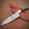 “Experience unparalleled sharpness and durability with this expertly crafted Damascus knife, featuring a majestic blade forged from high-carbon steel. The intricate patterned design, characteristic of Damascus steel, showcases a mesmerizing dance of light and shadow.