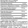 Contains Magnesium Citrate 100mg, Ashwagandha min 2.5% Withanolides 125mg, Magnolia Extract 2% Honokiol 50mg, Phosphatidylserine 50mg, Rhodiola Root Extract min 3% Rosavins, 1% Salidrosides 25mg per capsule.
