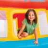 - This colorful bouncer comes equipped with a crawl-thru door for kids to easily crawl inside