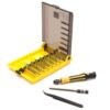 It includes one sturdy screwdriver handle, a pair of tweezers for delicate handling, an extension bar for those hard-to-reach places, seven CRV sockets, and 35 insert bits.