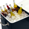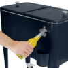 Rolling party cool box with integrated bottle opener and waste container drain valve at the bottom of the cooler box.
