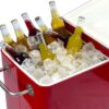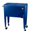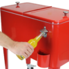 Rolling party cool box with integrated bottle opener and waste container drain valve at the bottom of the cooler box.